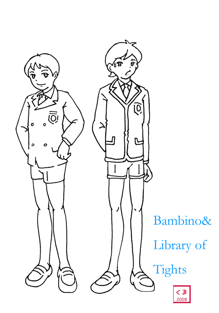 | 『Bambino』トップページ | ギャラリートップ | 『理想の学校制服タイツスタイル.1』 | ●2008.11.14イラスト1点公開 ●上記のイラスト解説。 ●みなさんもタイツ絵を描いてみませんか? 10/10タイツの日までのブログエントリーにてイラストリクエストをいただきここでイラストを公開してましたが、絵を描いているうちにそのような事を考えてました。 人様からのリクエストを受けて絵を描いてましたが、その逆にどなたか僕の考えているイメージを絵に描いてもらえないかなぁ、等と考えています。 絵の完成度の巧拙は問わずですがどなたか描いていただけないものかと。 *お題。 1.理想の学校制服タイツスタイル(男女年齢問わずです) 所謂スクールタイツスタイルは女子高生をはじめ、女の子の場合が当たり前で普通なのですけど、たまにその逆の発想ってないものかな。(^^; 強引な捉え方ですがつまり・・・場合によっては男子中高生もありと言う事です。 こう書くと男の子限定に見えてしまうところですが、男の子と女の子の組み合わせでも構いません。 あれこれと書いていても見当もつかないだろうと思い、説明を兼ねて自分で見本となるようなサンプルを描いてみました。 Bambinoの代表として福音学院の生徒を登場させました。『福音学院』の制服イメージは僕の中で長い間認めていた制服のイメージであり、そして白黒のどちらのカラーのタイツを着用する事が可能と言う想定の基で制作したのです。 下記には学校の解説を書き連ねてますが、あくまでもイラストに添えるイメージ作りのものなので、これは必要とはしません。 *福音学院初等科男子イメージより。 生徒の名前:篁 凌(たかむら りょう)(左)・荻乃 朔哉(おぎの さくや)(右) 学校:福音学院初等科(小中高大併設) 設定:福音学院初等科5年生。美術部に所属。(篁 凌に関する項目) 学校:東京福音学院初等科(小中高大併設) 設定:東京福音学院初等科5年生。吹奏楽部に所属。(荻乃 朔哉に関する項目) この小学校はスクールバスにて生徒送迎のため、なかなか生徒の制服姿は滅多に見かける事は少ない。 規定では、10月から4月まで初等科に限り男女生徒はタイツ着用。(当然、男子は半ズボン着用で長ズボンは着用禁止) (篁 凌に関する項目) 福音学院の姉妹校である東京福音学院。 規定では、学校式典等の行事に限り、初等科男女生徒は白タイツを着用する。 (荻乃 朔哉に関する項目) 福音学院の母体である福音聖母修道会の教え『汝 子弟の脚を温めたまえ』により、生徒のタイツ着用を強制させられる、と言うもの。 ただし、姉妹校の中で東京福音学院に限り、学校式典等行事に着用を限定させてしまったので通常の授業に置いてはタイツ着用は稀な事になってしまっている。結果的には福音聖母修道会の教えを実行させるため、式典等行事に着用の強制をさせている模様。 (この内容すべてはフィクションです) *福音学院の事項 タイツの色は式典行事には白タイツ、通常は黒タイツ着用。オプションとして、指定のカラータイツがあるが、まだ誰も着用していない。 *福音学院について 所在地:(非公開) 生徒数:(非公開) 創立:昭和33年 宗教:カトリック 福音聖母修道会フレンド派 併設校:幼、小、中、高、大 (この内容すべてはフィクションです) それと『絵心が全くない』と嘆きの方々には作品のぬり絵みたいな事も考えてみました。着色はお使いのドローイングソフト等をご使用いただければ幸いです。